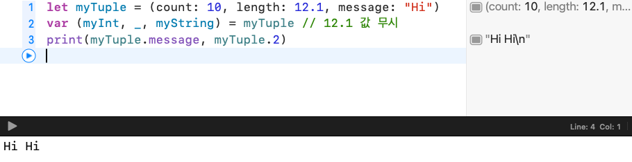 var (myInt, _, myString) = myTuple // 12.1 값 무시