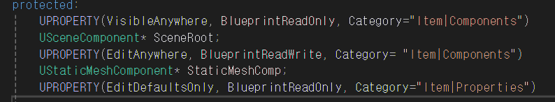 | VisibleAnywhere | 블루프린트에서 변수 값을 볼 수 있지만 수정은 불가능 |