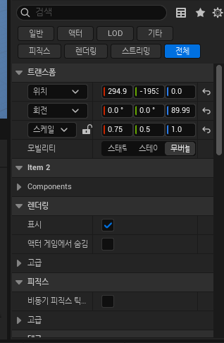 예를 들어 StaticMesh를 변경할 수 없다거나, 스케일이나 기본 회전 값 등 기본 설정 값들을 변경할 수 없다.