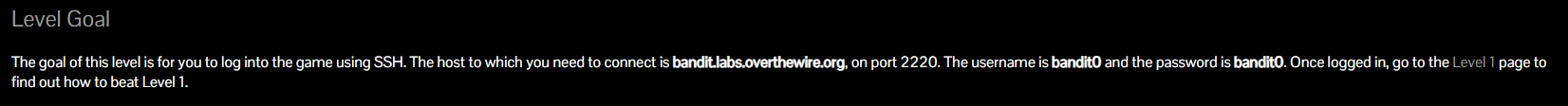 일단 문제를 보면 SSH를 사용하여 게임에 로그인 하라고 되어있다. 따라서 PuTTY를 사용하거나 Linux 터미널을 이용해 포트 2220의 bandit.labs.overthewire.org 라는 호스트 이름으로 접속하면 된다. 입력에 ssh bandit0@bandit.labs.overthewire.org -p 2220 을 작성하고 bandit0 이라는 bandit0 계정의 비밀번호를 입력하고 로그인하면 된다.