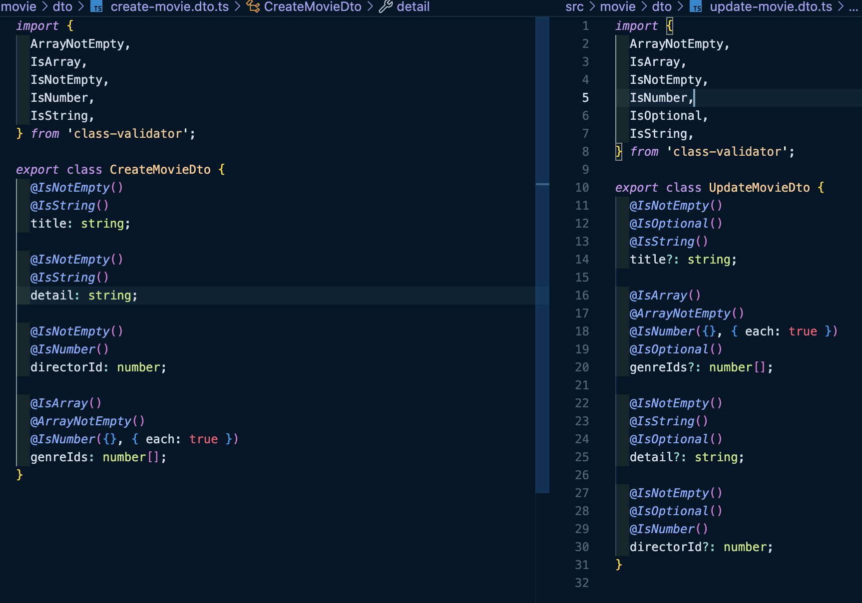 이미지보면 createDto와 UpdateDto의 각 필드의 class-validator가 isOptional 데코레이터만 제외하고 일치한다.