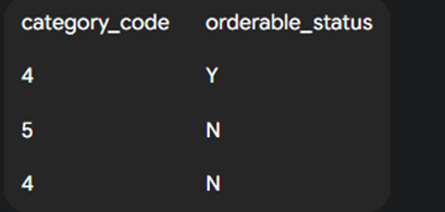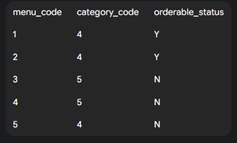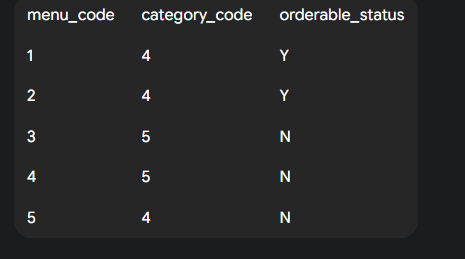 이 테이블에 SELECT DISTINCT category_code, orderable_status FROM tbl_menu; 쿼리를 실행하면, 시스템은 (category_code, orderable_status) 조합의 중복을 찾는다.