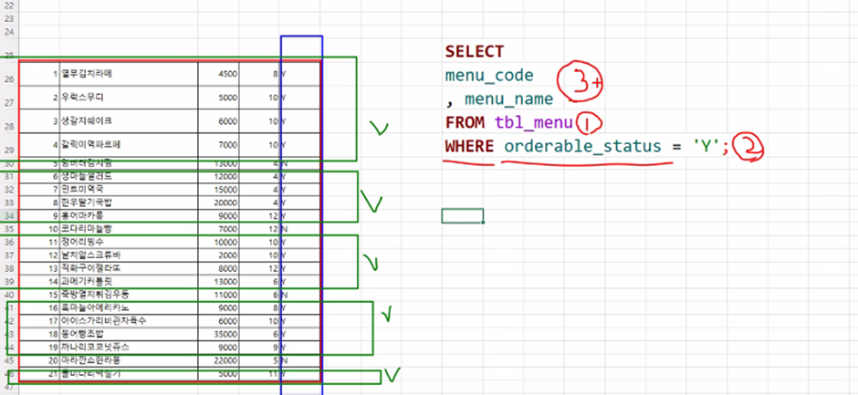 즉, AND 조건 처리는 menu_price가 9000이면서 menu_code가 10을 초과하는 모든 메뉴를 먼저 찾고, OR 조건 처리는 그 결과에 category_code가 4인 모든 메뉴를 추가로 포함하여 최종 결과를 보여준다.