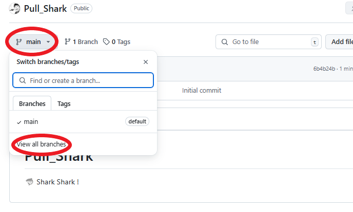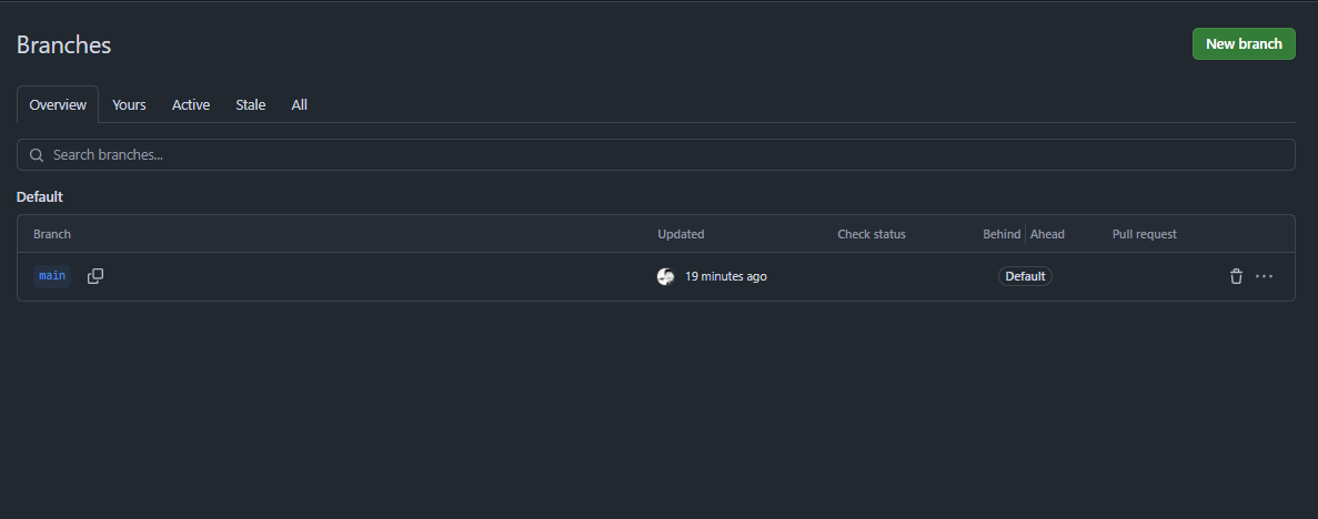 아직 브랜치를 만들지 않았기 때문에 default로 main 하나만 있는걸 볼 수 있다.