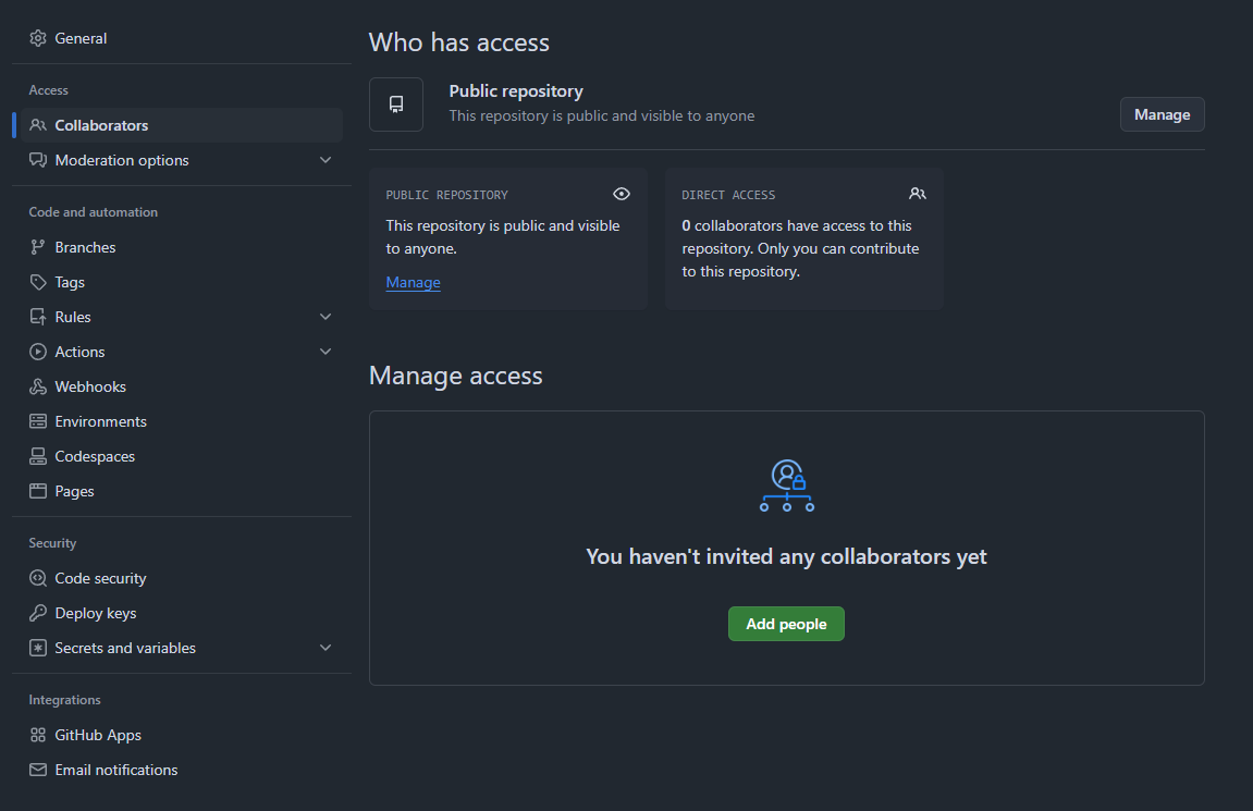 을 클릭해서 collaborators에 친구나 부계정을 입력해서 등록한다.