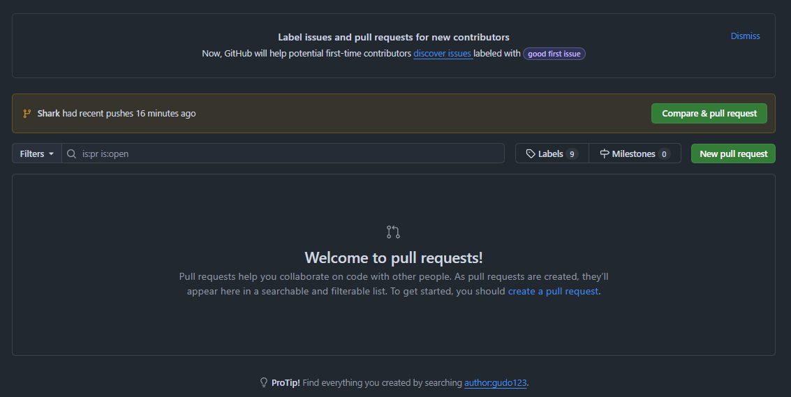 pull requests에 잘 왔다고 나를 반겨주는 모습,,,😢