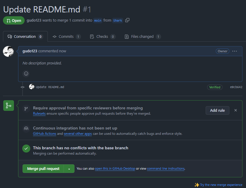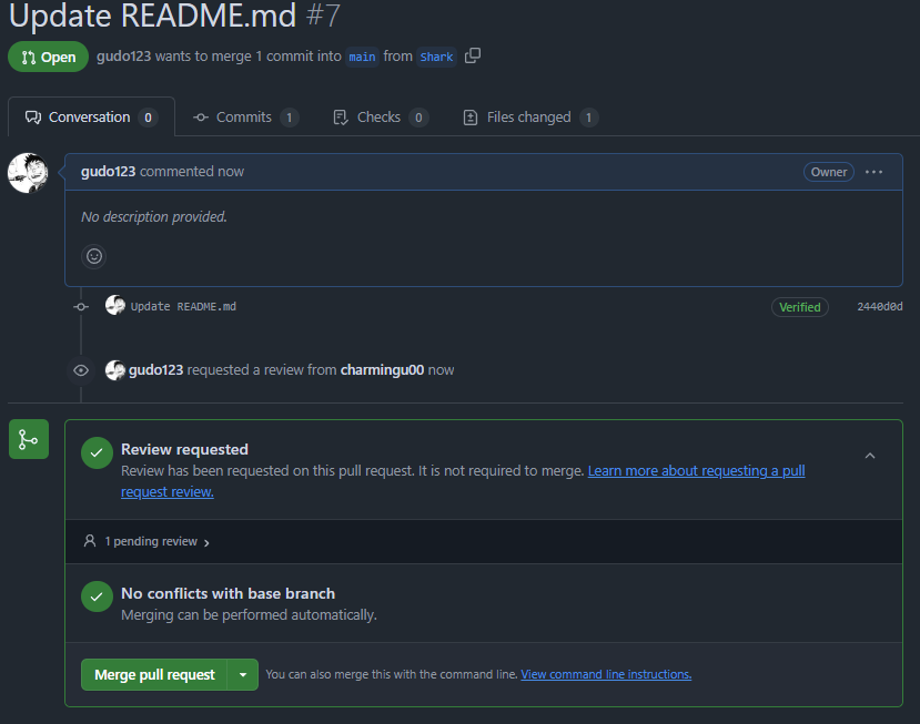 브랜치에서 README 파일을 수정했고 pull request를 진행한다.