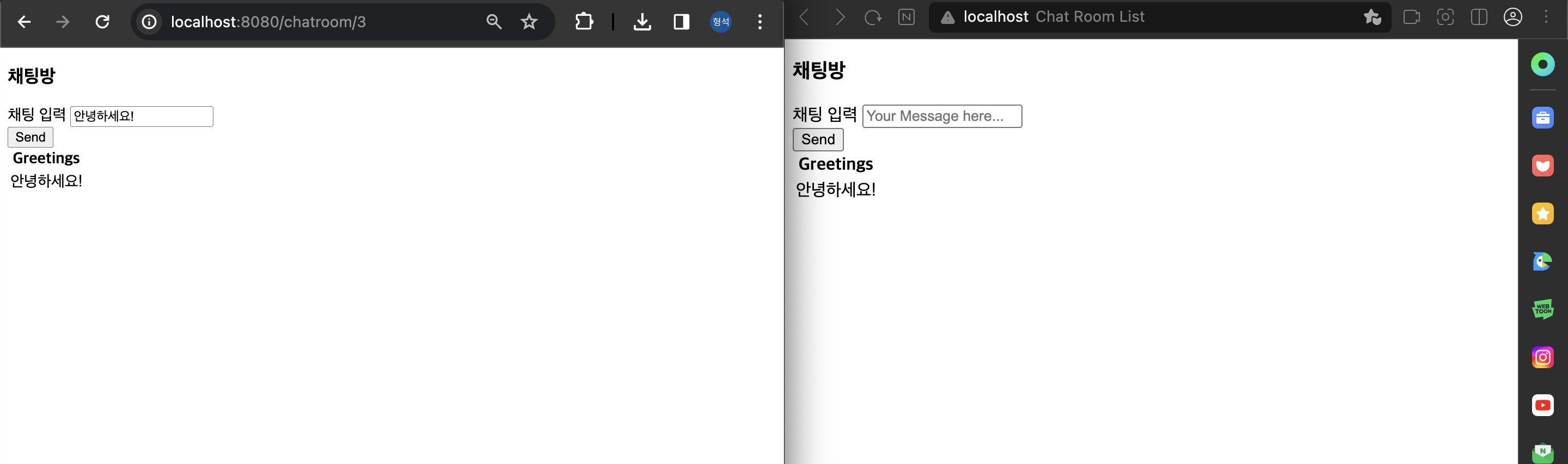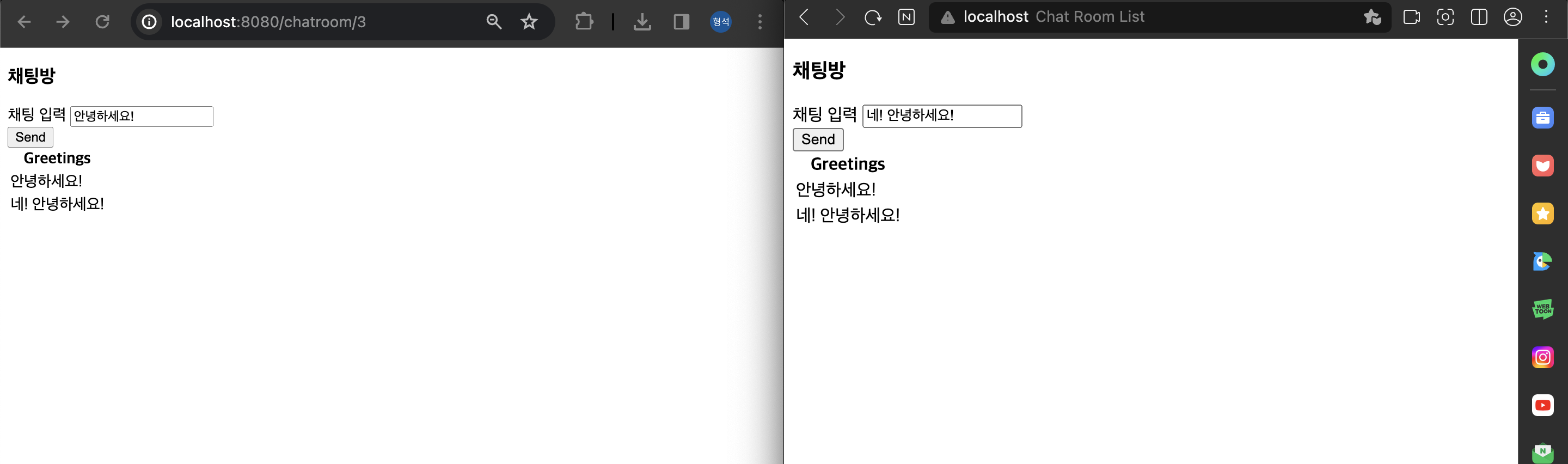 stompClient : ws://localhost:8080/gs-guide-websocket 경로를 통해 STOMP 연결 설정 후 생성된 STOMP 객체stompClient.onConnect : 웹 소켓이 연결될 때 호출되는 콜백 함수/topic/greetings/{chatroomId} 주제로 구독을 시작showGreeting() 함수를 호출하여 메시지를 표시sendMessage : 메시지를 전송하는 함수/app/hello/{chatroomId}로 메시지를 전송https://github.com/gudtjr2949/springboot-websocket