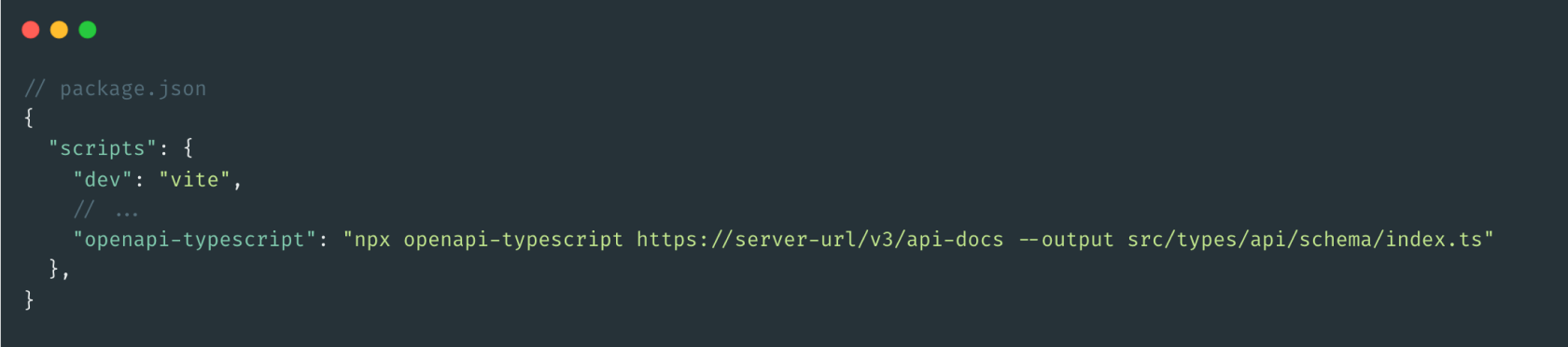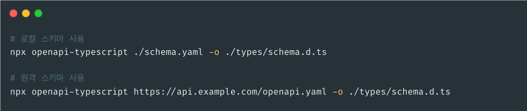 OAS 파일의 위치와, 실행 결과(생성된 타입들)가 저장될 위치를 지정해주고 npx 명령어를 통해 실행시켜 주면 됩니다. 간단하죠?