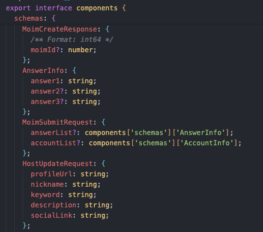 이와 같이 해당 파일에서 components import 하고, components['schemas']['이름']으로 타입을 사용할 수 있습니다.