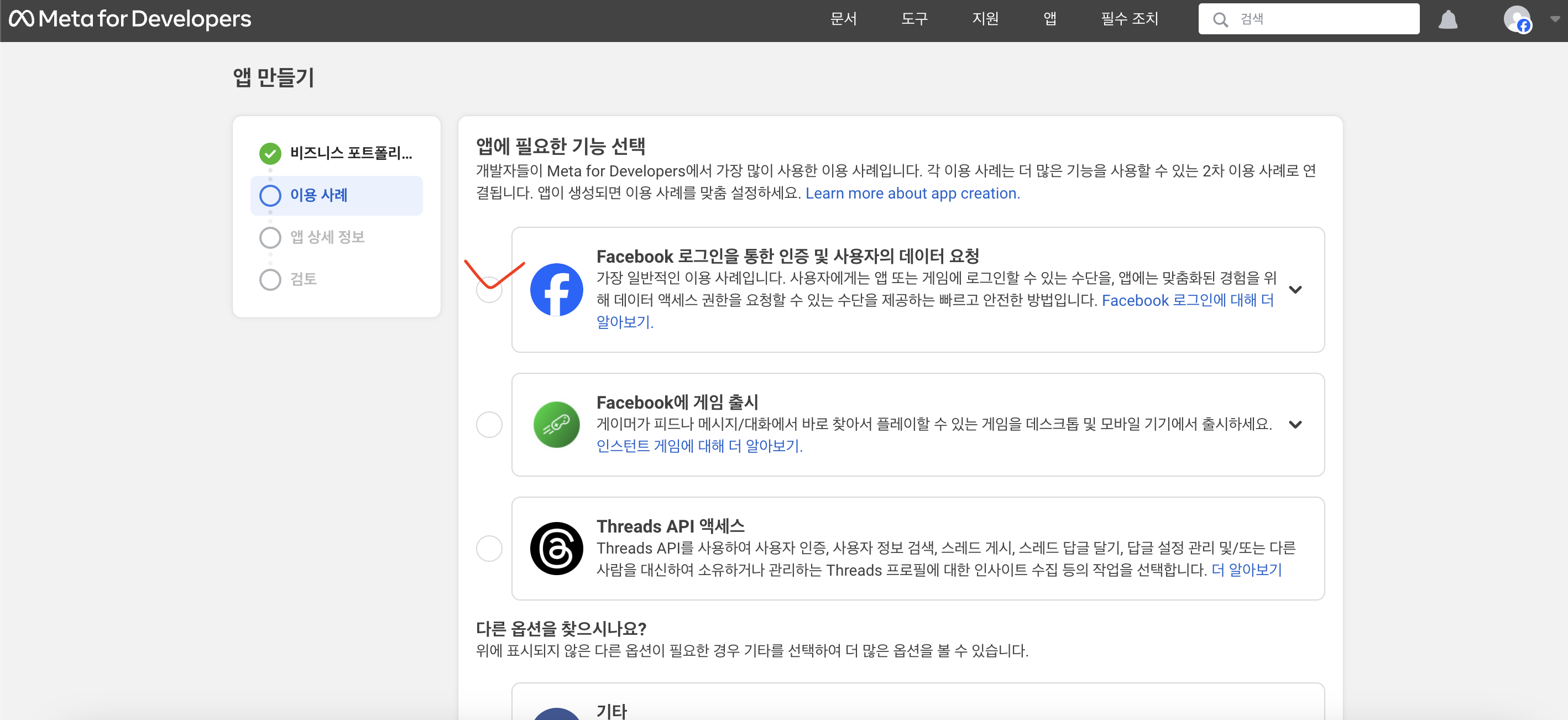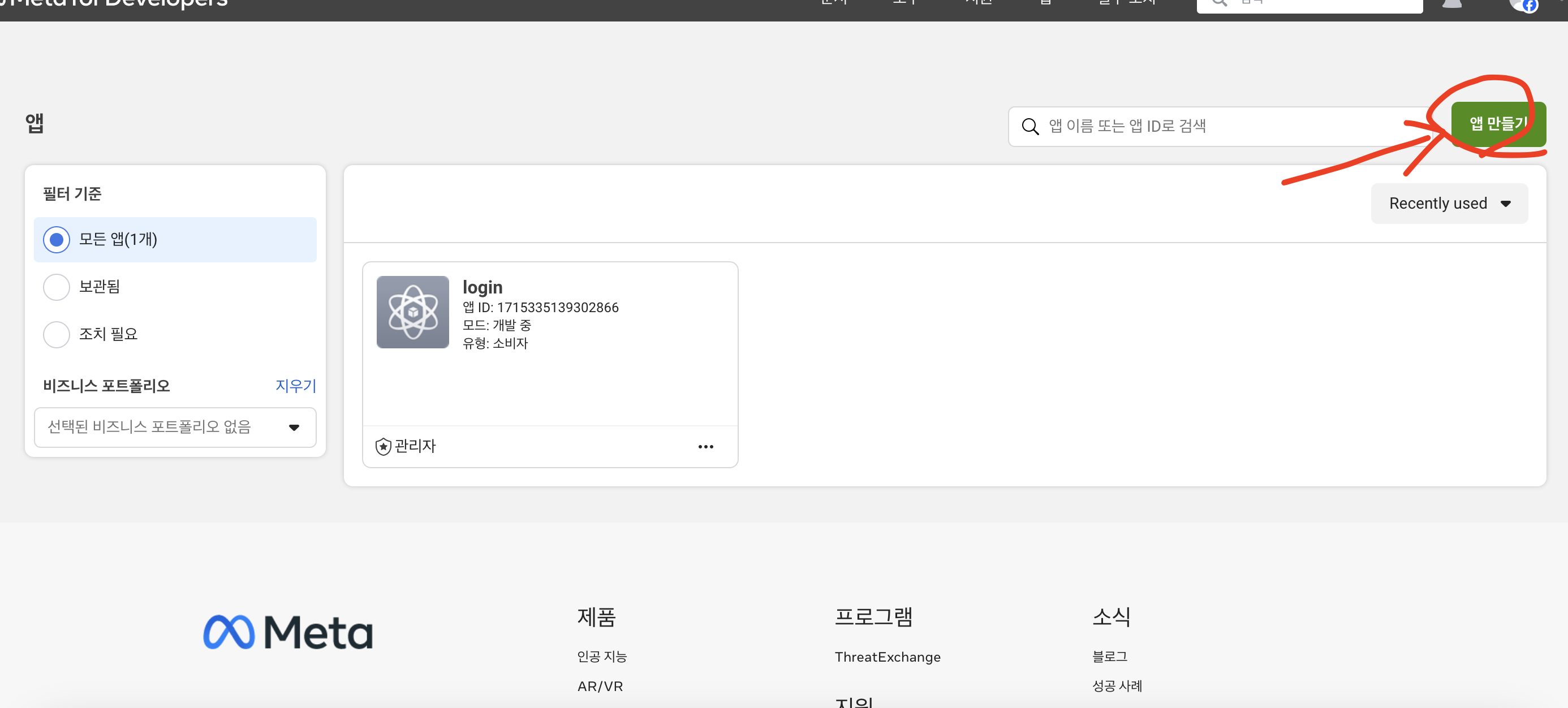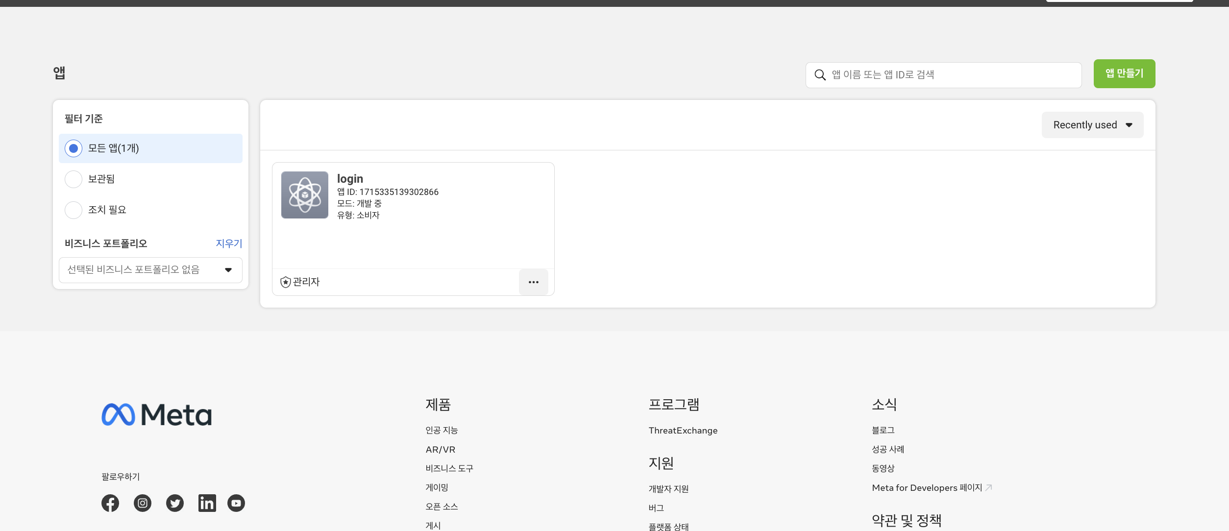 내 앱 누르면, 해당 화면이 나옵니다. facebook 로그인 클릭