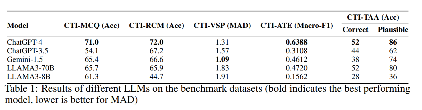 해당 연구에서는 CTI 환경에서 LLM의 성능을 평가하기 위해 CTIBench를 제안