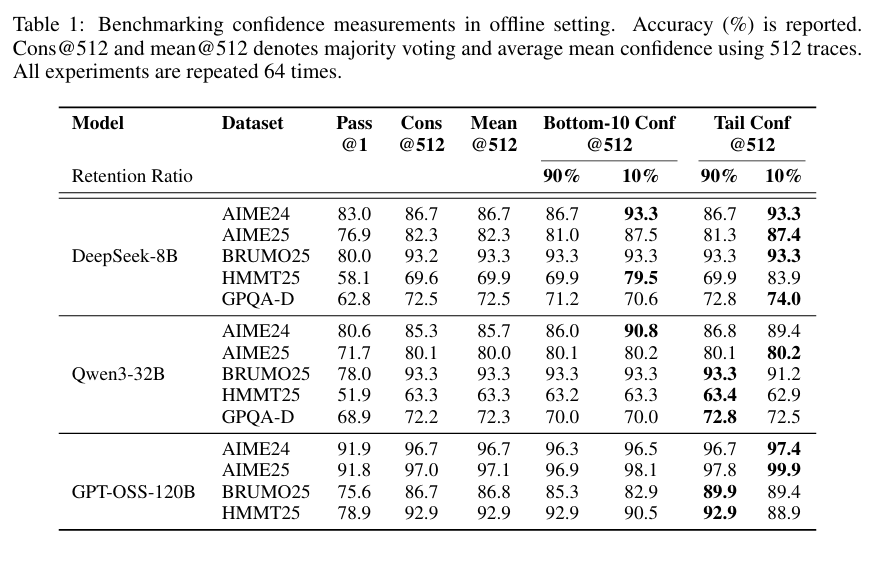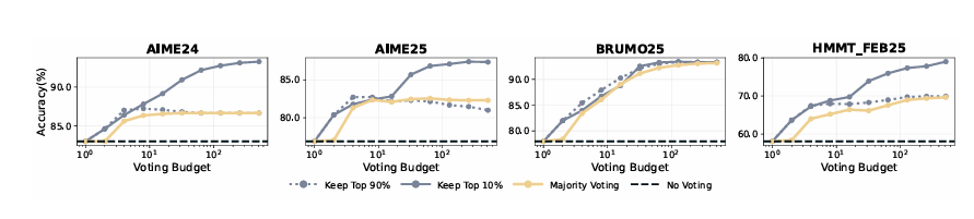 Confidence-aware weighting + filtering → 항상 Cons@512 (majority voting)보다 우수.