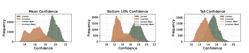 Figure 2 (논문 p.3) 비교에 따르면, Bottom 10% Confidence와 Tail Confidence가 단순 평균 confidence보다 정답/오답 구분 성능이 더 우수하다. 따라서 trace 품질 평가에 더 효과적이다.