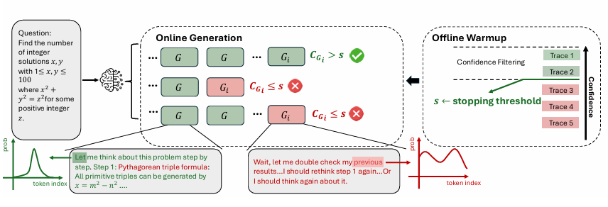 이러한 문제를 해결하기 위해 Deep Think with Confidence를 본 연구에서 제안한다. local confidence를 기반으로 병렬 추론과 confidence aware filtering을 결합하는 방법이다. 이는 offline, online의 두 모드에서 작동할 수 있도록 제안한다. 이 방법은 최종 정확도를 유지하거나 향상시키면서 불필요한 토큰 생성을 줄인다고 한다.