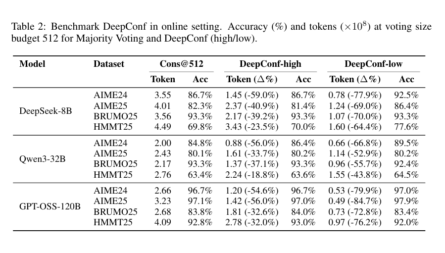 결과를 요약하면, DeepConf가 표준 다수결 방식보다 훨씬 적은 토큰으로 더 우수한 추론 성능을 달성함을 입증했다. 오프라인 모드에서 GPT-OSS-120B를 사용한 DeepConf@512는 AIME 2025에서 99.9% 정확도를 기록했으며, cons@512(97.0%), pass@1(91.8%)보다 높았다. 온라인 모드에서는 표준 병렬 추론 대비 토큰 생성을 최대 84.7% 줄이면서도 정확도를 유지하거나 초과하였다.
