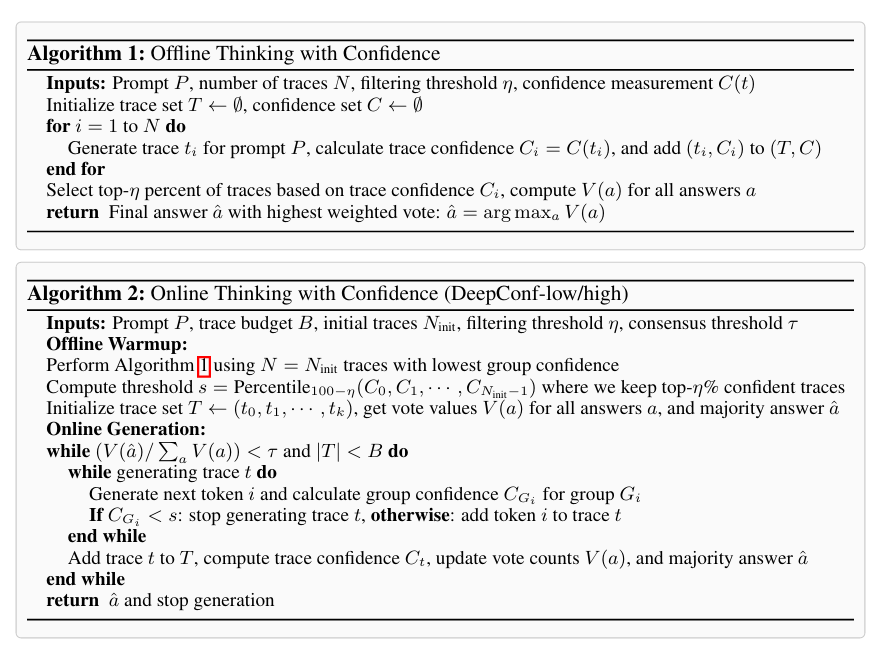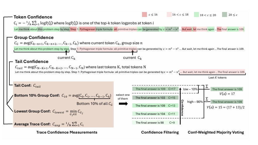 DeepConf 의 핵심은 모델 내부 confidence 신호를 활용해 저품질의 추론 trace를 filtering하거나 early stopping하는 것이라고 한다.