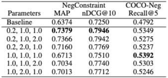 (원래 일관성), (긍정), (부정) 하이퍼파라미터의 영향을 분석했다. DEO는 테스트된 모든 설정에서 기준 모델보다 일관되게 우수한 성능을 보이며, 하이퍼파라미터 변화에 대한 강건성(robustness)을 입증한다. 텍스트 전용 NegConstraint 데이터셋에서는 일 때 MAP 0.7379, nDCG@10 0.7946으로 최고 성능을 보였다. 반면 COCO-Neg에서는 일 때 Recall@5 0.5392로 최고치를 기록했는데, 이는 CLIP과 같은 공유 비전-언어 공간에서 원래 의미론적 맥락을 유지하는 것이 중요하기 때문이다.