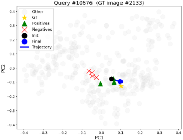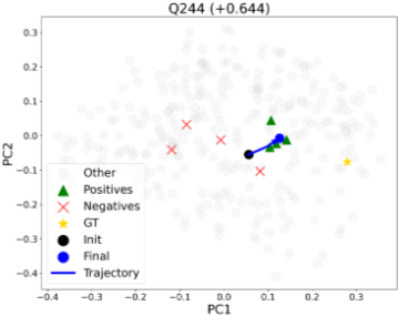 최적화된 질의 임베딩 가 긍정 임베딩 , 부정 임베딩 , 그리고 문서 임베딩에 대해 어떻게 변화하는지 시각화했다. PCA를 사용하여 BGE-M3의 전체 문서 임베딩에 투영된 질의 궤적, 분해된 하위 질의, 그리고 정답 문서를 2D 공간에 나타냈다. 초기 임베딩(검은색 점)은 긍정 하위 질의(녹색 삼각형)와 정답 문서(노란색 별)에 이끌리면서, 부정 하위 질의(빨간색 X)로부터 멀어지며 최적화된 지점(파란색 점)으로 점진적으로 이동한다. 이는 대비 최적화가 관련 영역으로 를 효과적으로 재구성하고 부정적인 요소를 억제함을 확인한다. 이 분석은 CLIP의 비전-언어 공간에서도 동일한 패턴을 보이며, DEO가 텍스트 검색과 교차 모달 이미지 검색 모두에 일반화됨을 보여준다.