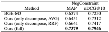 질의 분해 단계의 역할을 분석하기 위해 'Only Decompose' 변형을 실험했다. 이는 분해된 긍정 및 부정 하위 질의의 평균 임베딩을 사용하거나, 각 하위 질의별로 검색한 후 Reciprocal Rank Fusion (RRF)으로 결과를 병합하는 방식이다. 질의 분해만으로는 기준선 대비 제한적인 개선만을 보였다. RRF 기반 집계(aggregation)는 추가적인 이점을 제공하지만, 전체 DEO 방법론의 성능에는 훨씬 못 미친다. 이는 성능 향상이 질의 분해 자체보다는 후속 임베딩 최적화에서 비롯됨을 시사한다.