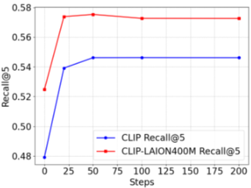 최적화 단계 수에 따른 검색 성능을 분석했다. NegConstraint와 COCO-Neg 모두에서 0단계에서 20단계로 증가할 때 성능이 급격히 향상되며, 20단계에서 50단계 사이에서 안정적으로 유지된다. 100단계 이상에서는 점진적으로 감소하는 경향을 보인다. 20-50단계가 강력한 성능을 달성하기에 충분하며, 모든 실험에서 20단계를 기본 설정으로 사용한다.