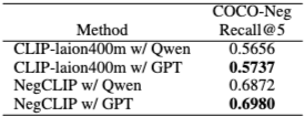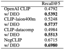 DEO는 COCO-Neg 데이터셋에서 모든 CLIP 기반 모델의 Recall@5를 일관되게 향상시킨다. OpenAI CLIP은 가장 큰 폭으로 6.00% 증가하고, CLIP-Datacomp과 CLIP-laion400m도 각각 5.29%와 4.89% 향상된다. 부정 인식 모델인 NegCLIP도 0.6715에서 0.6980으로 향상되어, DEO가 기존 부정 인식 모델에도 추가적인 이점을 제공함을 확인한다. 이는 DEO가 다중 모달 검색 설정에도 효과적으로 일반화됨을 증명한다.