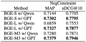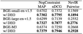 DEO는 NegConstraint와 NevIR 벤치마크에서 모든 BGE 변형 모델의 성능을 일관되게 향상시킨다. NegConstraint에서 BGE-large-en-v1.5는 DEO 적용 후 MAP가 +0.1028 (16.32%), nDCG@10이 +0.0738 (10.34%) 증가한다. NevIR의 Pairwise 점수도 BGE-small-en-v1.5에서 0.1569에서 0.1894로, BGE-large-en-v1.5에서 0.2552에서 0.2776으로, BGE-M3에서 0.2668에서 0.2928로 향상된다. 이는 DEO가 부정 제약 조건 하에서 더 나은 검색을 가능하게 함을 보여준다.