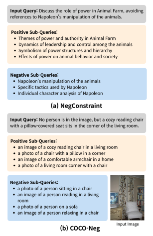 이 논문은 미세 조정이나 추가 데이터셋 없이 부정 및 제외를 인식하는 검색을 위한 간단하면서도 효과적인 방법인 DEO를 제안한다. DEO는 사용자 질의를 긍정 및 부정 하위 질의로 분해하고, 대비 손실을 통해 임베딩 공간을 직접 최적화하여 사용자 의도에 더 정확하게 부합하는 질의 임베딩을 생성한다. 실험 결과, DEO는 텍스트 및 다중 모달 검색 태스크 모두에서 기준 모델보다 일관되게 우수한 성능을 보였다. 이러한 결과는 사용자 질의에 부정과 제외가 빈번하게 포함되는 실제 시나리오에서 DEO 접근 방식의 강건성과 실용성을 강조한다.