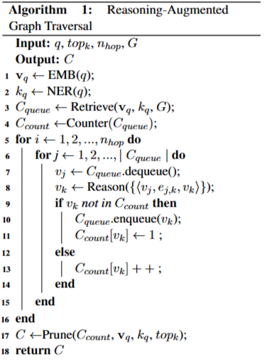 질의 의 키워드 와 벡터 를 얻은 후, 식 (1)을 사용하여 상위 개의 유사한 에지 를 찾는다. 이 에지들로부터 얻은 각 정점 로 너비 우선 지역 검색(breadth-first local search)을 위한 문맥 큐()를 초기화한다.