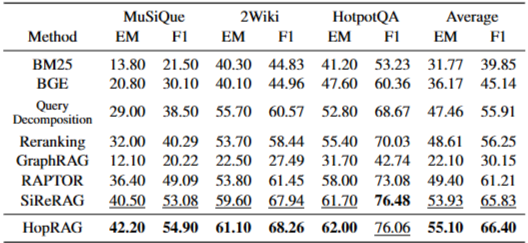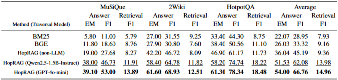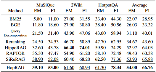 HopRAG는 거의 모든 실험 설정에서 최상의 성능을 보였다. 특히, GPT-3.5-turbo 및 GPT-4o를 사용한 실험에서 HopRAG는 기존의 밀집 검색기(BGE)보다 약 76.78%, 질의 분해 방식보다 48.62%, 재순위화 방식보다 36.25% 더 높은 성능을 달성했다. 또한 RAPTOR, HippoRAG, SiReRAG와 같은 최신 RAG 시스템보다도 우수한 성능을 보였다. 이는 HopRAG가 텍스트 유사성과 논리적 관계를 모두 효과적으로 포착하여 다중 홉 QA 작업에 강점을 가짐을 시사한다. BM25 및 BGE와 같은 기존의 유사성 기반 검색기는 논리적 관련성을 포착하지 못해 낮은 성능을 보였다. GraphRAG 및 RAPTOR는 질의 중심 요약에는 적합하지만 다중 홉 QA 작업에서는 HopRAG보다 낮은 성능을 보였다. HopRAG는 HippoRAG보다 소폭 우수한 성능을 보였는데, HopRAG가 유사성과 논리적 관계를 통합하여 에지를 구축하기 때문이다.
