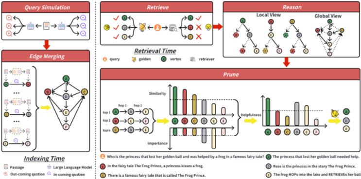 HopRAG는 그래프 구조의 지식 탐색을 통해 검색에 논리적 추론을 추가하는 새로운 RAG 프레임워크이다. 인덱싱 단계에서 HopRAG는 텍스트 청크를 정점(vertex)으로, LLM이 생성한 의사 질의pseudo-query를 논리적 연결을 나타내는 edge로 사용하여 구절 그래프를 구축한다. 검색 단계에서는 "retrieve-reason-prune" 메커니즘을 사용한다. 이는 어휘적으로 또는 의미적으로 유사한 구절에서 시작하여 의사 질의와 LLM 추론의 안내를 받아 다중 홉 이웃을 탐색하며, 이를 통해 진정으로 관련 있는 구절을 식별한다.