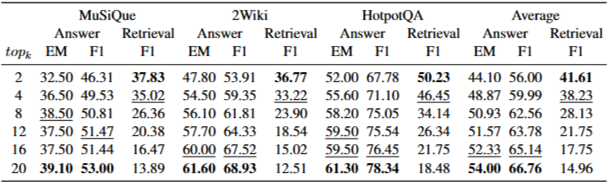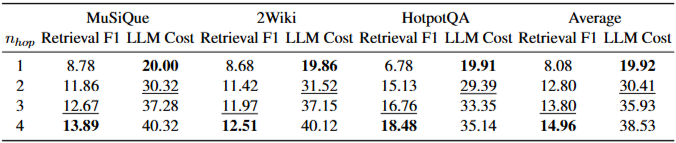 topk의 영향: topk 값이 작을 때(예: 12개 후보)도 HopRAG의 QA 성능은 20개 후보를 사용하는 다른 시스템과 비견될 만하다. 이는 HopRAG의 그래프 순회 설계가 제한된 문맥 길이 내에서 정보를 효율적으로 검색하는 데 효과적임을 나타낸다. topk가 증가함에 따라 검색 F1 점수는 불필요한 정보의 포함으로 인해 감소하는 경향이 있지만, LLM의 처리 능력 덕분에 응답 품질은 일반적으로 향상된다.nhop의 영향: nhop이 증가함에 따라 검색 성능은 향상되지만, LLM 호출 비용도 증가하여 성능과 비용 사이에 상충 관계가 존재한다. 평균적으로 4번째 홉에서 큐 길이는 2.60, 5번째 홉에서 1.23으로 급격히 감소하며, 이는 4번의 홉으로도 그래프 구조 내의 지역 영역을 충분히 탐색할 수 있음을 나타낸다.HopRAG는 논리 인식 검색 메커니즘을 갖춘 새로운 RAG 시스템이다. 이 시스템은 의사 질의를 통해 관련 구절을 연결하며, 간접적으로 관련 있는 구절의 다중 홉 이웃 내에서 진정으로 관련 있는 구절을 식별하여 검색의 정밀도와 재현율을 크게 향상시킨다. 다중 홉 QA 벤치마크에 대한 광범위한 실험을 통해 HopRAG는 기존 RAG 시스템 및 최신 기준선보다 우수한 성능을 입증했다. 이는 검색 모듈에 논리적 추론을 통합하는 것의 효과를 강조한다. HopRAG는 추론 기반 지식 검색의 길을 열었으며, 향후 연구는 QA 작업 외의 더 넓은 도메인으로의 확장과 더 낮은 계산 비용으로 복잡한 시나리오를 위한 인덱싱 및 순회 전략 최적화를 포함한다.