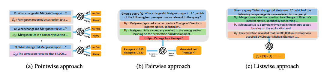 본 절에서는 정보 검색에서 사용되는 주요 reranking 접근법을 pointwise, pairwise, listwise의 세 가지 범주로 나누어 설명한다. 이들 방법은 문서 간 관계를 어떻게 고려하는지, 그리고 효율성과 성능 간의 균형을 어떻게 맞추는지에서 차이를 보인다.