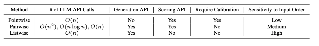 Pointwise 방식은 질의–문서 쌍을 독립적으로 평가하여 관련성 점수를 산출하며, O(n)의 계산 복잡도를 가진다. 일반적으로 프롬프트를 통해 “Yes/No” 형태의 판단을 생성하고, 출력 토큰의 확률을 점수로 변환한다. 그러나 이 방식은 프롬프트에 따라 점수 분포가 일관되지 않게 보정되는 문제가 있으며, 이는 순위 결정에 반드시 필요하지 않은 과정이라는 점이 지적된다. 또한 확률 점수에 접근할 수 있는 scoring API에 의존하기 때문에, GPT-4와 같은 생성 전용 LLM에서는 적용이 제한된다.