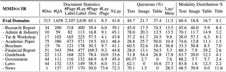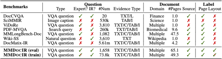 MMDocIR 벤치마크는 전문가가 주석을 단 1,685개 질문과 부트스트랩된 레이블이 있는 173,843개의 질문을 특징으로 한다.