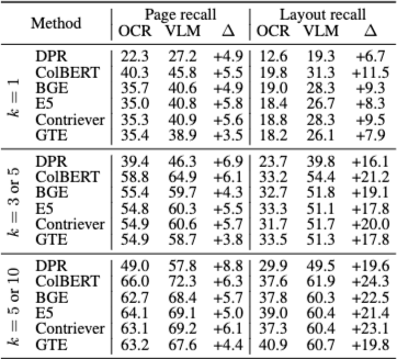 특히 페이지 수준 검색에서는 입력 길이 제한(512 토큰)으로 인해 많은 페이지에서 정보 손실이 발생한다. 반면 레이아웃 수준 텍스트는 상대적으로 짧기 때문에, 텍스트 검색기가 레이아웃 검색에서 더 경쟁력 있는 성능을 보인다.