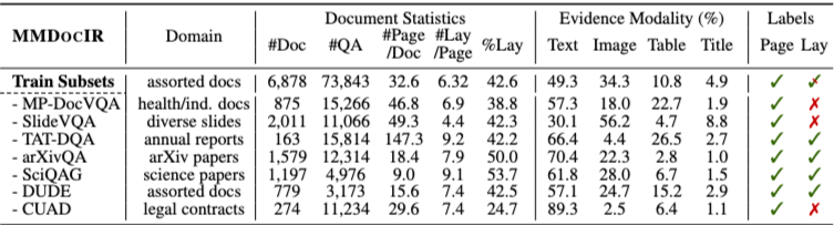 또한 저자들은 검색기 학습을 지원하기 위한 MMDOCIR 훈련 세트를 함께 제안한다. 해당 훈련 세트는 7개의 DocQA 계열 데이터셋에서 수집한 73,843개의 질문과 6,878개의 문서로 구성되어 있으며, 수동 문서 수집과 준자동화된 파이프라인을 통해 페이지 및 레이아웃 수준 정답 레이블이 주석되었다.