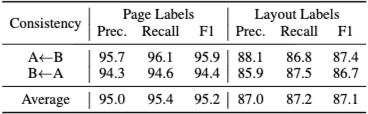 상호 평가(Cross-evaluation): 페이지 및 레이아웃 주석에 대해 높은 일치도를 확인하고 불일치를 수정