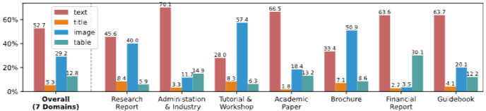 MMDocIR 평가 세트는 313개의 장문 문서로 구성되며, 문서당 평균 65.1페이지를 포함한다. 전체 문서는 10개 도메인으로 분류되며, 도메인에 따라 멀티모달 구성 비율이 뚜렷하게 달라진다. 예를 들어 보고서나 튜토리얼 문서는 이미지 비중이 높고, 금융·산업 문서는 표가 풍부하며, 정부·법률 문서는 텍스트 중심의 구성을 가진다.