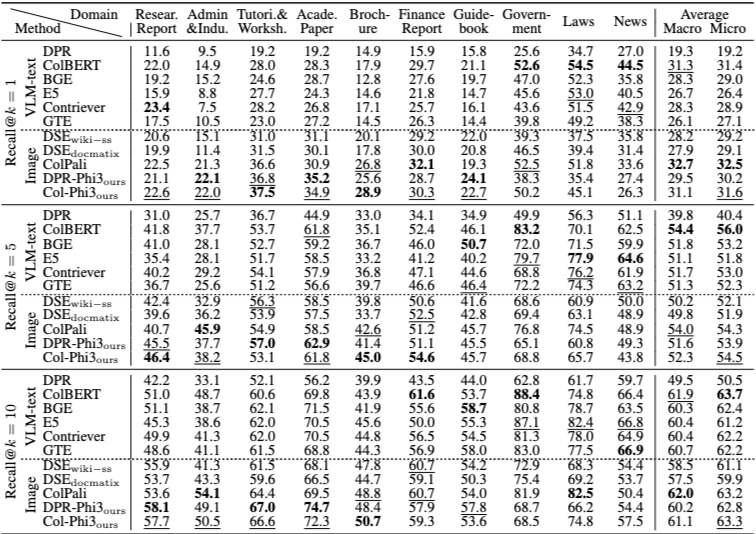 또한 순수 이미지 입력을 사용하는 시각 검색기가, 이미지–텍스트를 혼합한 하이브리드 입력보다 더 나은 성능을 보이는 경향이 관찰된다. 이는 현재 VLM이 멀티모달 설정에서 텍스트보다 이미지를 모델링하는 데 더 강점을 가질 가능성을 보여준다.