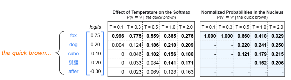 샘플링 하이퍼파라미터를 조정하면 추론 시 선택되는 tokens가 달라진다. language confusion을 샘플링의 바람직하지 않은 부작용으로 보고, 분포를 더 sharp하게 만들면 혼동을 줄일 수 있다.