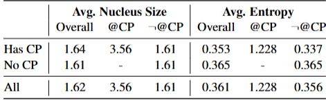 각 스텝에서 Shannon entropy와 nucleus size를 계산한다. 한 예시에서 CP 시점의 후보 중 “called”가 세 번째로 가능성이 높았으나(정규화 확률 0.221) 샘플될 만큼 확률이 컸다. 프롬프트당 100 tokens를 생성하므로 전체 1,500 스텝 중 9개가 CP이며, 나머지는 비 CP이다.