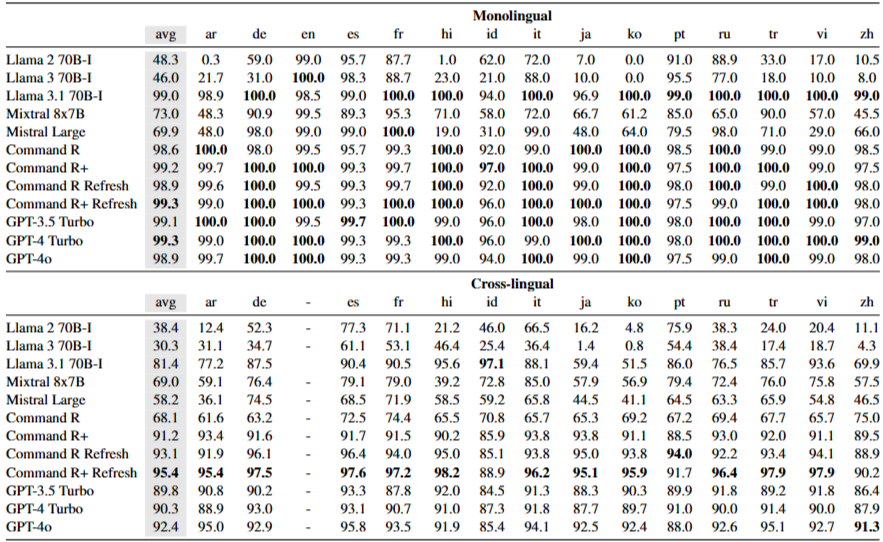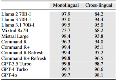 보다 어려운 교차언어 설정에서는 최상위 모델들의 LPR이 90% 초반대이다. 전반적으로 Command와 OpenAI 계열이 가장 우수하며, 그중 Command R+가 종합 최상위이다. Llama는 영어로 응답하는 경향 때문에 두 모델 모두 30%대 LPR로 성능이 낮다. Mistral Large는 유럽어에서도 Mixtral보다 뒤처진다. 비라틴 문자권 언어에서도 Command R+와 OpenAI 계열이 다시 최상위이다. LCPR 추세는 단일언어와 비슷하지만 절대 점수는 더 낮다. GPT-3.5 Turbo가 가장 높고, Command R+와 GPT-4 Turbo가 그 뒤를 잇는다. 단일언어와 달리 교차언어에서는 Command R이 R+보다 현저히 낮다.
