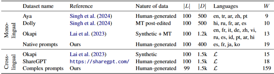 단일언어 과제와 교차언어 과제는 각각 총 2,600개와 4,500개 프롬프트로 구성되며, 영어, 프랑스어, 독일어, 스페인어, 포르투갈어, 이탈리아어, 일본어, 한국어, 중국어, 아랍어, 터키어, 힌디어, 러시아어, 인도네시아어, 베트남어 등 15개의 계통적으로 다양한 언어를 다룬다. 자세한 내용은 표 1에 나와 있다.