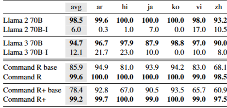 base 모델의 language confusion은 downstream 성능과 강하게 상관하지 않는다. 더 강한 base(예: Command R+, Llama 3 70B)가 오히려 더 혼동되는 경우가 있다. 사전학습에서 번역·타언어 tokens 노출이 존재하므로 일정 수준의 언어 전환이 나타나며, 이후 instruction tuning이 원하는 거동을 강화하는 것으로 보인다.