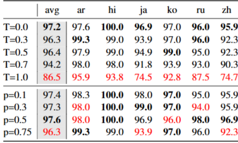temperature (T) 와 nucleus (p) 를 조절해 오답 언어 token이 선택될 확률을 낮춘다. 단일언어 설정에서 Command R의 WPR을 보면 T가 높을수록 혼동이 커진다. T=1에서 평균 WPR이 83.5%이며, 일본어 72.0%, 중국어 69.5%까지 하락한다. p 조정의 효과는 상대적으로 작다.