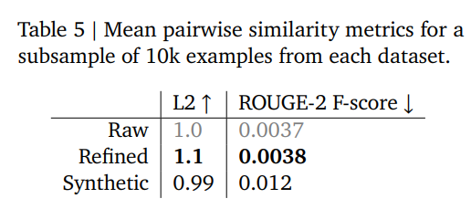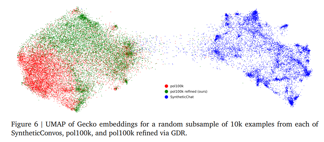 Figure 6 (p.11) UMAP 시각화에서도 SyntheticChat은 밀집된 cluster(다양성 부족)를 보이지만, Raw/Refined는 넓은 분포를 유지.