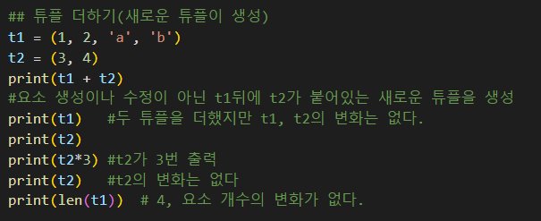 튜플의 요소가 생성되거나 수정되는 것이 아닌 튜플의 요소가 이어진 새로운 튜플이 생성