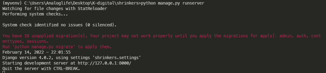 스크립트 폴더 안에 장고를 설치해서 다시 삭제 후 shrinkers 폴더 안에 장고를 설치했다.