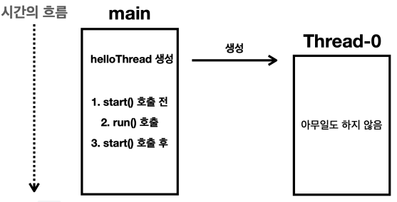 main 스레드는 HelloThread 인스턴스에 있는 run() 이라는 메서드를 호출한다.